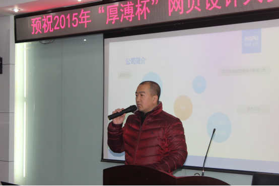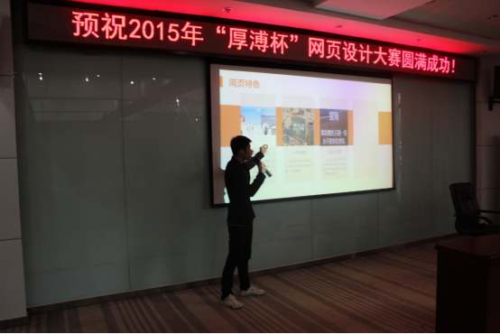 2015年“厚溥杯”網頁設計大賽由武漢厚溥教育科技有限公司技術中心主辦,技術中心于2015年11月中旬開始組織策劃,入圍決賽的學校由荊州職業技術學院、湖北國土資源職業學院、湖北科技職業學院、武漢工程職業技術學院、黃岡職業技術學院、武漢外語外事職業學院、湖北三峽職業技術學院、武漢軟件工程職業學院、河南水利與環境職業學院、河南信息統計學院、河南教育學院、貴州職業技術學院厚溥IT學院12所院校的23支隊伍組成,各校區于12月11號之前進行內部選拔,最終每個校區確定2個團隊參加12月19號在光谷總部組織的總決賽。