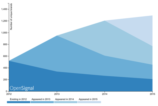 圖中最大的變化不是三星的主要競爭對手擴展了多少份額,而是上百家小型廠商的出現。OpenSignal表示發現了1294家獨立生產商,其中超過1000家在2012年的時候還根本不存在。值得注意的是,一些2012年還存在的廠商現在已經消失了,所以我們看到的增幅或許沒有那么大。
